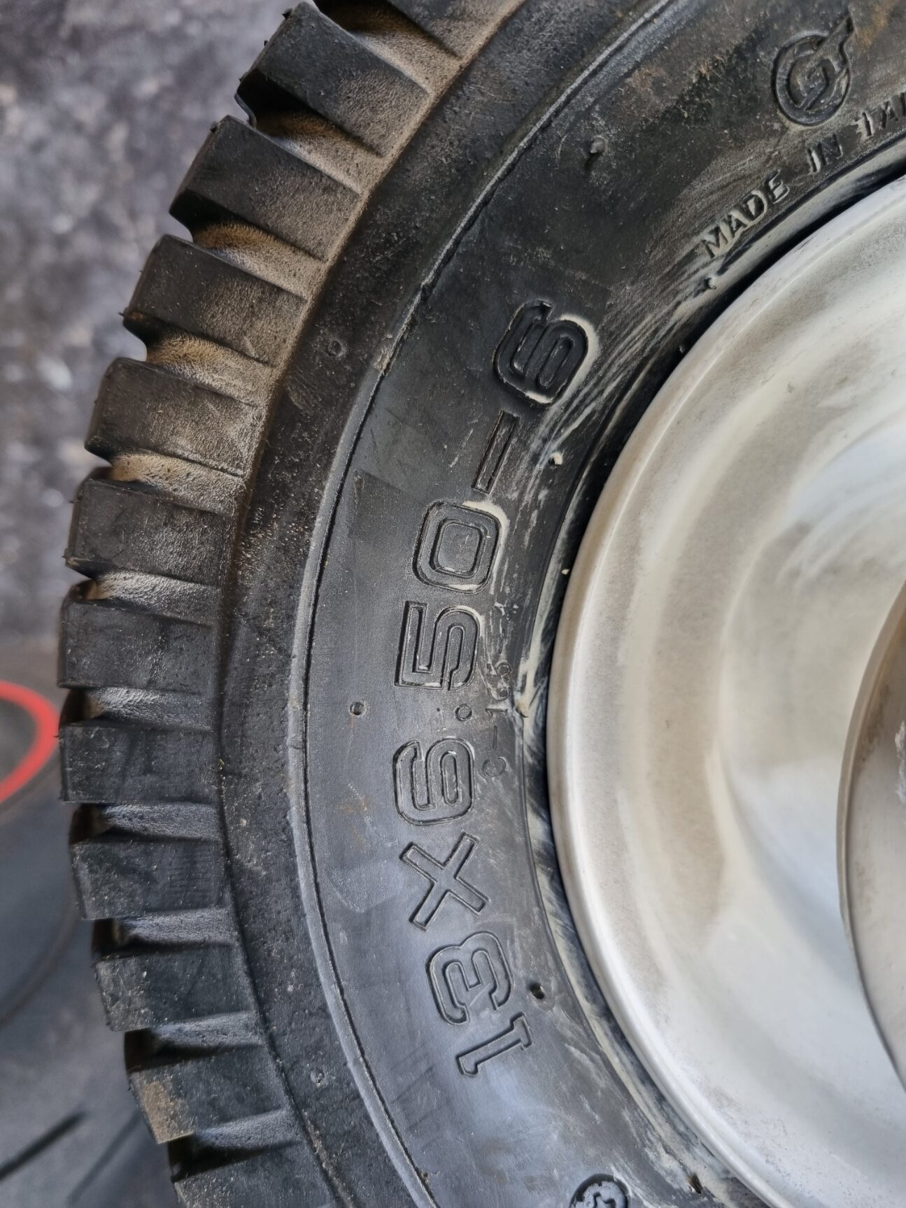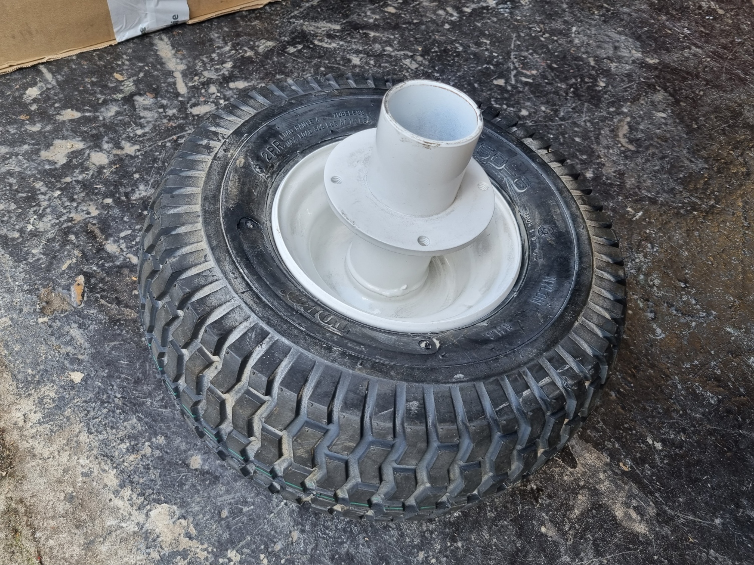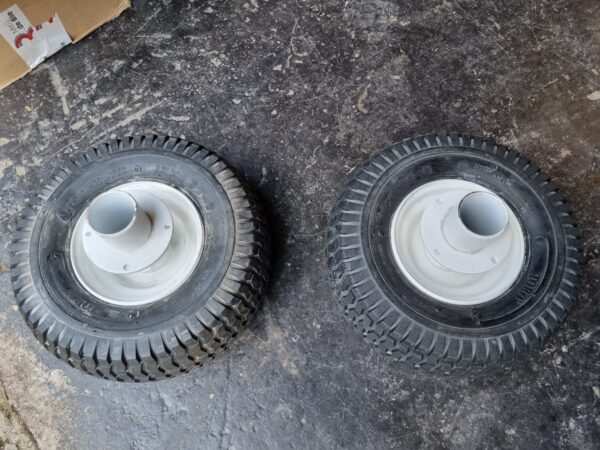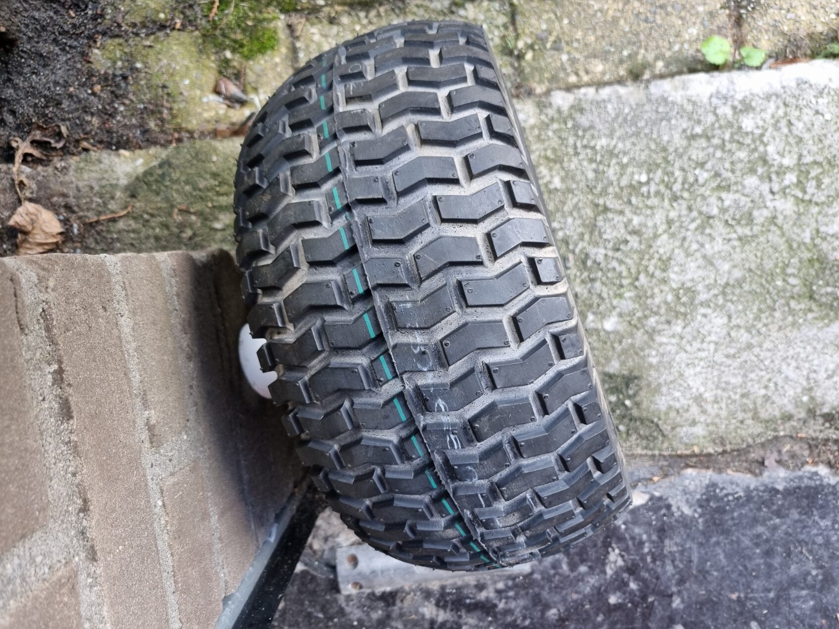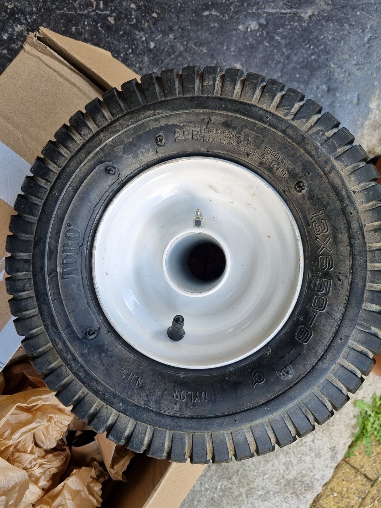 Nieuwe banden inclusief nieuwe velgen van een Toro 30165 loopmaaier.