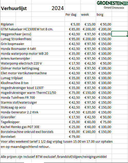 Heeft u een Trilplaat, stronkenfrees, tuinfrees, hogedrukreiniger of tegelknipper nodig? Meestal gebruikt u dat soort apparaten maar een paar keer per jaar en staan ze verder te verstoffen in een hoekje. Huren is dan goedkoper dan kopen. Bij Groenestein Technoservice wordt het apparaat goed onderhouden en kunt u de gewenste machine met alle bijbehorende apparatuur huren.
